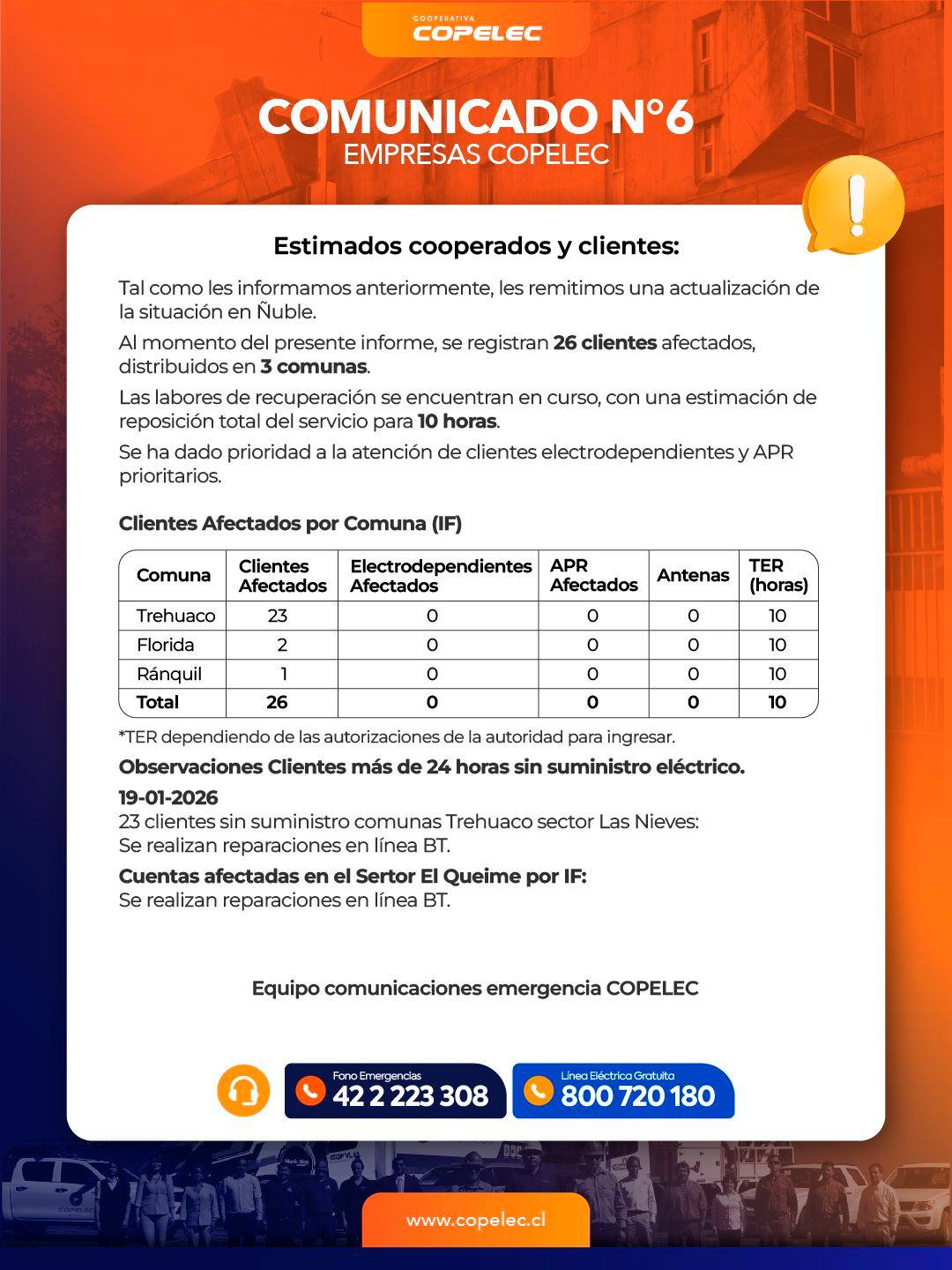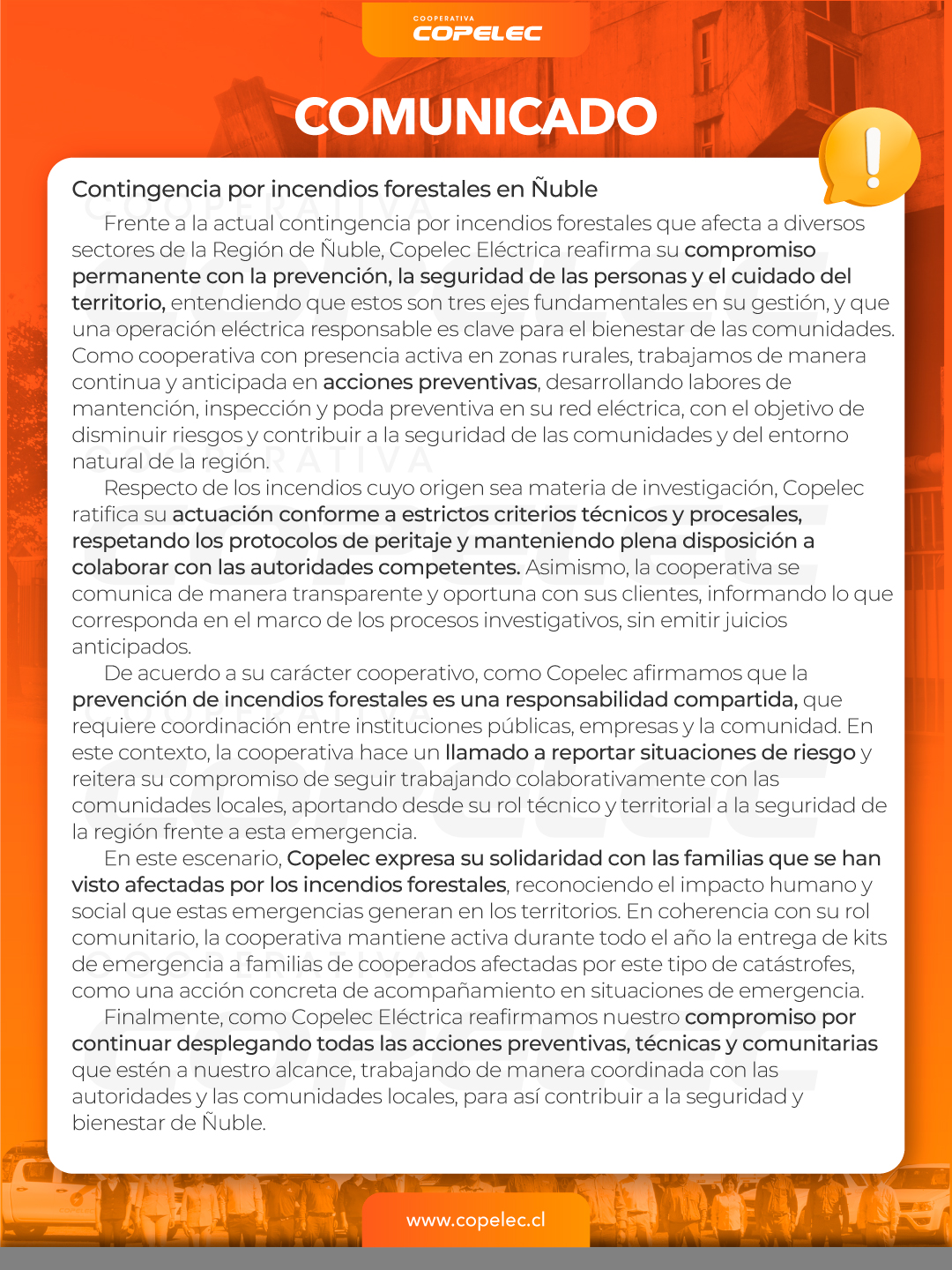 En este contexto, Copelec hizo un llamado a cooperados y clientes a extremar las medidas de autocuidado, evitando manipular instalaciones eléctricas dañadas, mantenerse alejados de postes o líneas eléctricas caídas y reportar cualquier situación de riesgo a través de los canales oficiales de atención.